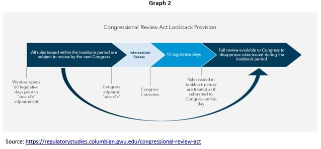 Before a rule can take effect, an agency must submit a report to each house of Congress and the comptroller general. After receiving the information, members of Congress have 60 legislative days[i] during which the House and Senate must submit and act on a joint resolution of disapproval. Once both chambers approve the joint resolution, it is forwarded to the President for approval. A Presidential veto can be overridden by a two-thirds vote of the House and Senate. (Graph 2)