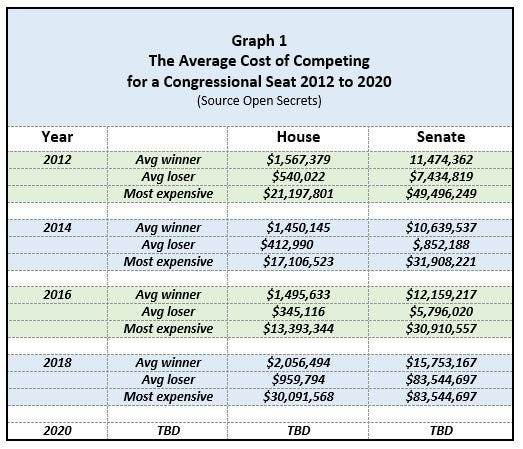 To put these sums in some context, Graph 1 shows the average cost of winning and losing a seat in the House and Senate between 2012 and 2018. The numbers for the 2020 election are still being reported to the Federal Election Commission (FEC). However, readers would be right in thinking those numbers will continue the upward sweep of election costs.