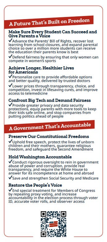 The Commitment speaks in generalities combining traditional Republican themes, e.g., increasing domestic oil and gas production, with more extreme positions. Under the heading, A Government That’s Accountable, is the commitment of House Republicans to uphold free speech and protect the lives of unborn children and their mothers.