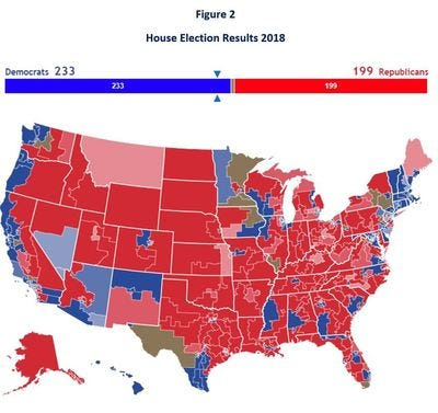 Figure 2 illustrates just how geographically widespread the Republican landscape is even with the Democrats in control of the House. Although all Republicans in the red areas are not Trumplicans, many are far more conservative than progressive Democrats — so too are the constituents of many of the returning (incumbent) Democratic House members. To have a chance of winning the Senate majority and the White House in 2020, Democrats will have to win over centrist voters in states such as Colorado, Maine, Iowa, North Carolina, and Alabama. It is what it is.