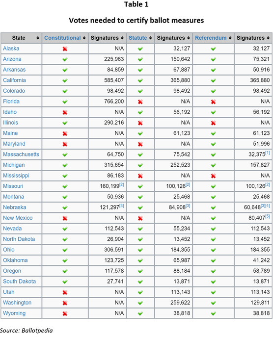 Many of the requirements are based on a percentage of the number of overall votes in the last election. Table 1 shows the number of signatures needed to qualify a measure for certification in initiative and referendum states. Colorado, for example, requires 88,492 squiggles in a state with a voting-age population of 4,109,494.