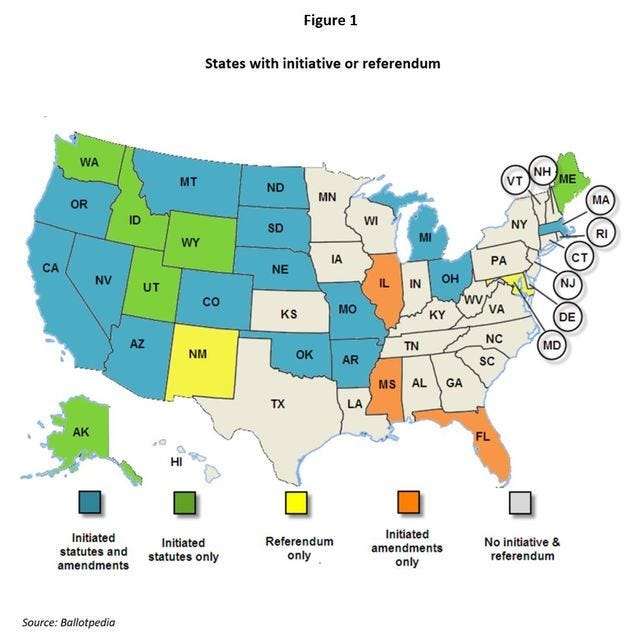 Although the discussion has focused on state initiatives and referendum, it should be noted that citizen–led ballot measures are also eligible to be placed on many city and county ballots. A discussion for another day.
