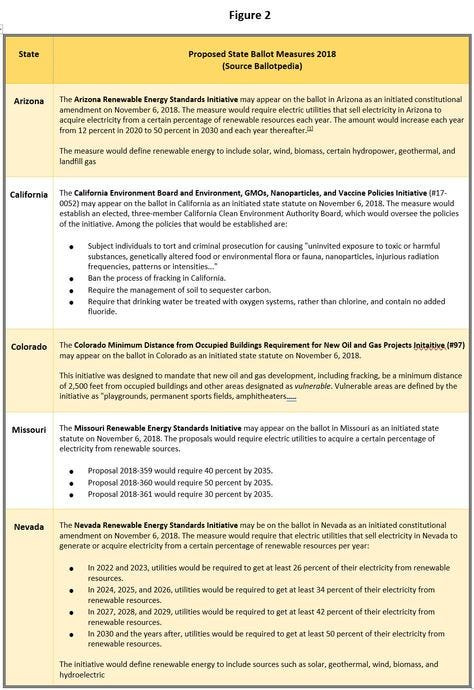 Although not nearly as popular as marijuana legalization, there are five clean energy and environmental measures that may be on several state ballots come November. Three of the five involve renewable energy standards. Of the five, three would add amendments to the state’s constitution. Figure 2 below identifies by state the likely 2018 climate-related measures that will find their way onto the November ballots. There is still time for others to be added.